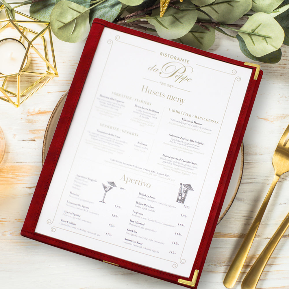 MENU PRODUCTION manufactures custom menu covers in a variety of fixing mechanism specifications. The choice of fixing method depends entirely on the size of your menu and how you want it to look. Do you want a contemporary menu or do you need something that complements a more traditional setting?